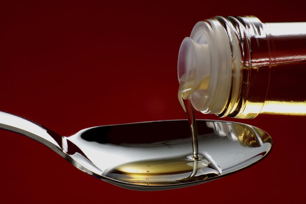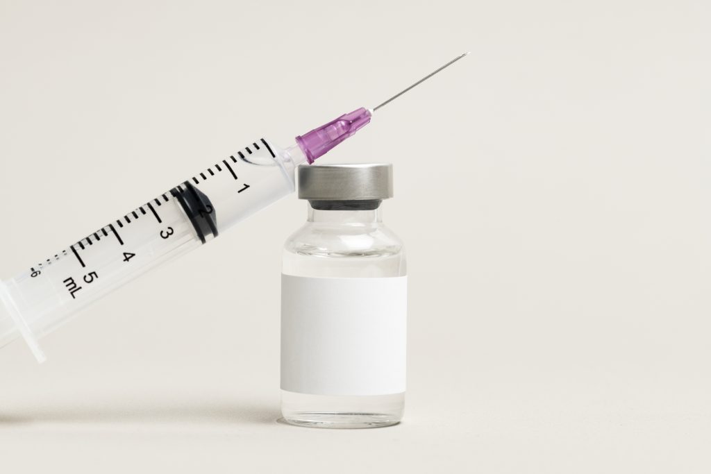 Blank white label on injection bottle glass vial with syringe